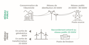 La machine se compose de pales (3 en général) portées par un rotor et installées au sommet d’un mât vertical. Cet ensemble est fixé sur une nacelle qui abrite un générateur électrique. Le vent fait tourner les pales entre 8 et 14 tours par minute. Le générateur transforme l’énergie mécanique ainsi créée en énergie électrique. L’énergie électrique produite intègre le réseau public à partir d’un poste de livraison avant d’être redistribuée en temps réel là où la demande est la plus importante. Selon le principe du système solidaire, un équilibre est assuré par RTE et Enedis pour permettre à chacun de pouvoir bénéficier d’électricité à tout moment, même si aucune source d’électricité n’existe à proximité.